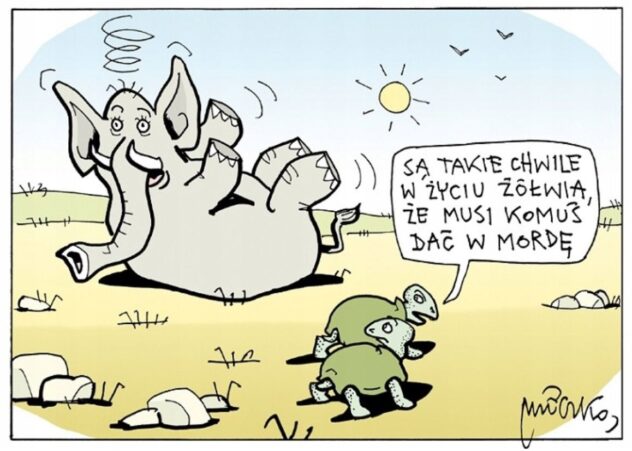 W sumie to niezłym wstępem jest rysunek Andrzeja Mleczki, który świetnie oddaje moje aktualne podejście do świata i okolic. Tyle tylko, że bicie bliźnich, nawet jeśli zasłużyli, jest czemuś niemile widziane…